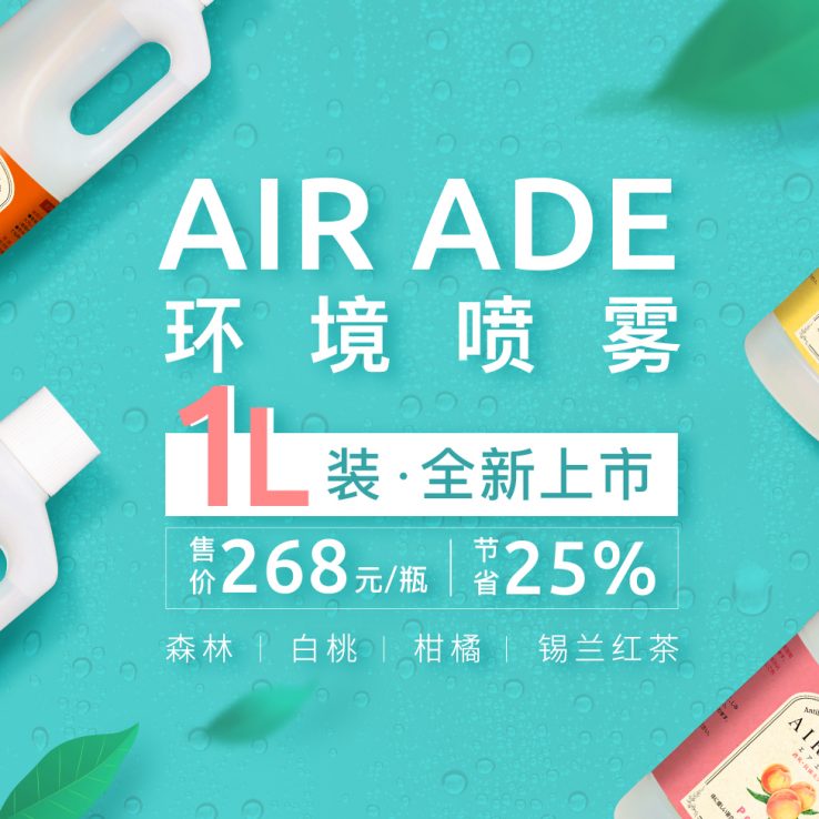 4月20日,AIR ADE环境喷雾1L装补充液上市。 为喜爱AIR ADE产品的用户,带来更经济的产品。